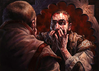 Blood is a significant theme in this set, with cards like Curse of the Bloody Tome already, but it seems to be more like a reflection card like Evil Twin, if i had to guess though i'm calling this is a blue or red card most likely based off the theme in the mirror, onto another piece of art.